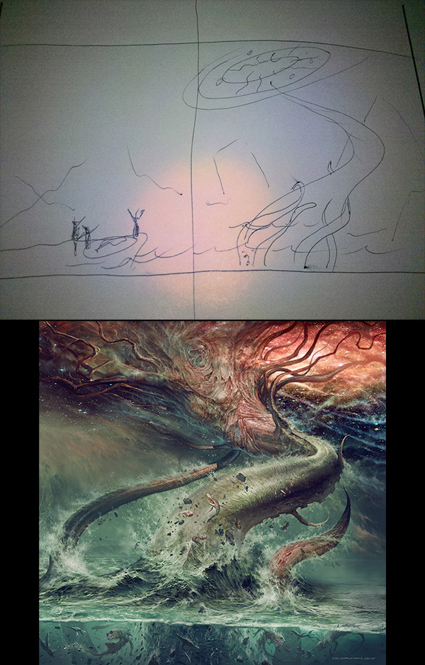 Op Facebook zag ik de allereerste schets die Marten stuurde naar Ola Larsson. Daarop is het hele artwork gebaseerd? Het lijkt haast een grap; ongelooflijk! Jullie moeten wel onvoorwaardelijk vertrouwen hebben in Larsson. Dit is echt een van de best ogende covers die ik de laatste jaren gezien heb!