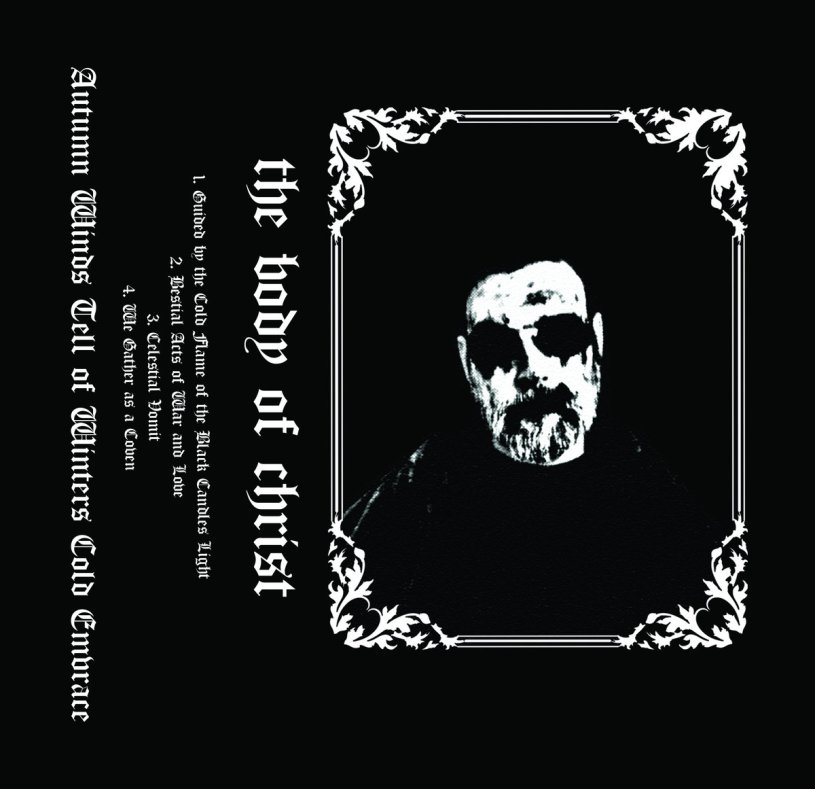 Het Lichaam van Christus, ook wel het Allerheiligste genoemd, is een andere benaming voor een geconsacreerde hostie, naar de woorden van Jezus: “Neemt en eet, dit is Mijn Lichaam”. De term wordt ook gebruikt als aanduiding voor de katholieke Kerk. Het gecorpsepainte individu achter The Body Of Christ moet van al wat heilig is niet veel weten en componeerde vier songs die op de debuut EP “Autumn winds tell of winter’s cold embrace” gebundeld werden. The Hell Command – gekend van o.a. Worsen en Ayr – zette zijn schouders onder dit éénmansproject afkomstig uit North Carolina en brengt het onding op een tot 100 stuks gelimiteerde tape uit. De zwartmetalen klanken zijn primitief en rauw, maar de productie overstijgt de gangbare keldersound die gangbaar is in het wereldje der vampieren, trollen en vleermuizen. Op tijd en stond vallen de drums en zang in de meer dan negen minutende durende opener “Guided by the cold flame of the black candle’s light” weg om enkel de gitaar te laten weergalmen doorheen de atmosfeer. Het geeft het totaalpakket een winderig en aards karakter evenals een ritualistisch tintje mee. Het tempo is doorgaans gematigd, hoewel er ook wel enkele snellere uitbarstingen aanwezig zijn. “Bestial acts of war and love” wordt met allerhande samples van tsjirpende vogeltjes opgeluisterd en trekt de “zalven en slaan” aanpak van de opener verder door hoewel de up-tempo stukken een heel pak woester binnenkomen. De openingsriff is dan weer eerder downtempo van opzet. “Celestial vomit” – waarin we wederom een hele dierentuin aan samplegeluiden horen – muteert halfweg naar een zwartgeblakerd sludgenummer en heeft ook wat van die typische post-blackgrootsheid in zijn melodieën vervat zitten in plaats van ons met snijdende tremolo’s te bekogelen. “We gather as a coven” is vrij experimenteel van opzet en hangt aaneen van de naargeestige samples en gitaareffecten hoewel er ook een kortstondige blackmetaluitbarsting is. De songstructuren die The Body Of Christ op “Autumn winds tell of winter’s cold embrace” hanteert zijn niet alledaags en geven dit project een eigen identiteit die echter niet voor iedereen zal weggelegd zijn. Ik ben wel getriggerd om deze band in de toekomst te blijven volgen.