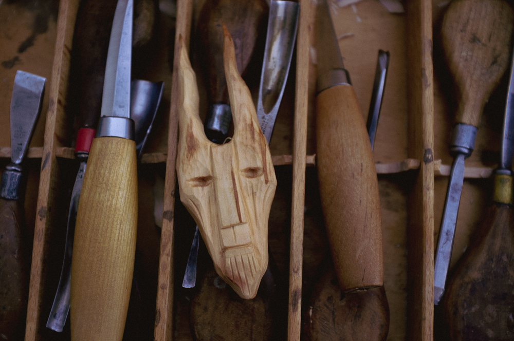 Ik snij veel verschillende dingen, en soms weet ik niet wat het resultaat zal zijn. Ik volg gewoon de structuur van het hout en kijk waar het me heen leidt. Op een dag eindigde ik met het snijden van wat leek op een demon of duivel. Toen het moment aanbrak om “Knippe” op tape uit te brengen, dacht ik dat het wel goed bij de muziek zou passen, en besloot ik tien demonen te maken voor een speciale tape-editie. Ze waren meteen uitverkocht, en sinds mensen me bleven vragen naar die demonen, zijn er in opdracht nieuwe gemaakt. Ik snij sowieso bijna elke dag, dus dit is een leuke bijkomstigheid van de muziek. Je kunt ze demonen, ‘Fanden’ of wat dan ook noemen. Kleine idolen om de donkere aspecten van de natuur en het leven te aanbidden.