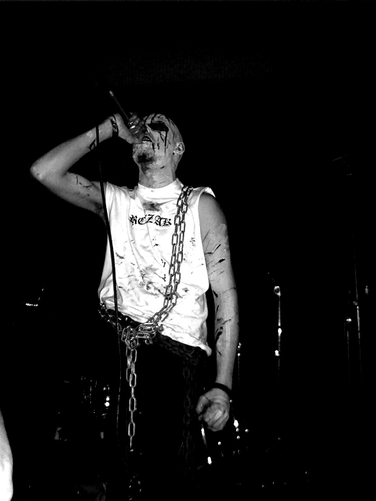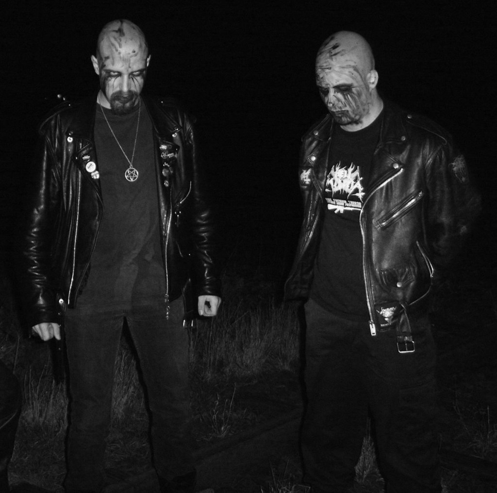 Ja, het gebeurde al eens dat hij een mes bovenhaalde tijdens de optredens, met name tijdens het nummer “Verminking” durfde hij nogal tekeer te gaan. Ik herinner me bv. een voorval waarbij hij zich toch net iets te diep had gesneden, en tijdens de rit naar huis bleek dat dat lederen zakje, waar de schakelpook van de auto in zit, mooi tot aan de rand was volgelopen met bloed. Als je spreekt over ‘gevaar’, dan moet ik eerlijk gezegd wel toegeven dat het allemaal wat braver is geworden t.o.v. toen. Kijk naar de stank van Watain, het schizofrene van Maniac, of Niklas’ provocerende panseksualiteit. Geweldig toch! Wanneer ieder van ons reeds op het podium stond en de intro begon, moest Verderf nog naar het podium komen, en dat deed ie vanaf de achterkant van de zaal. Wie niet opzij stapte, werd opzij geslagen…