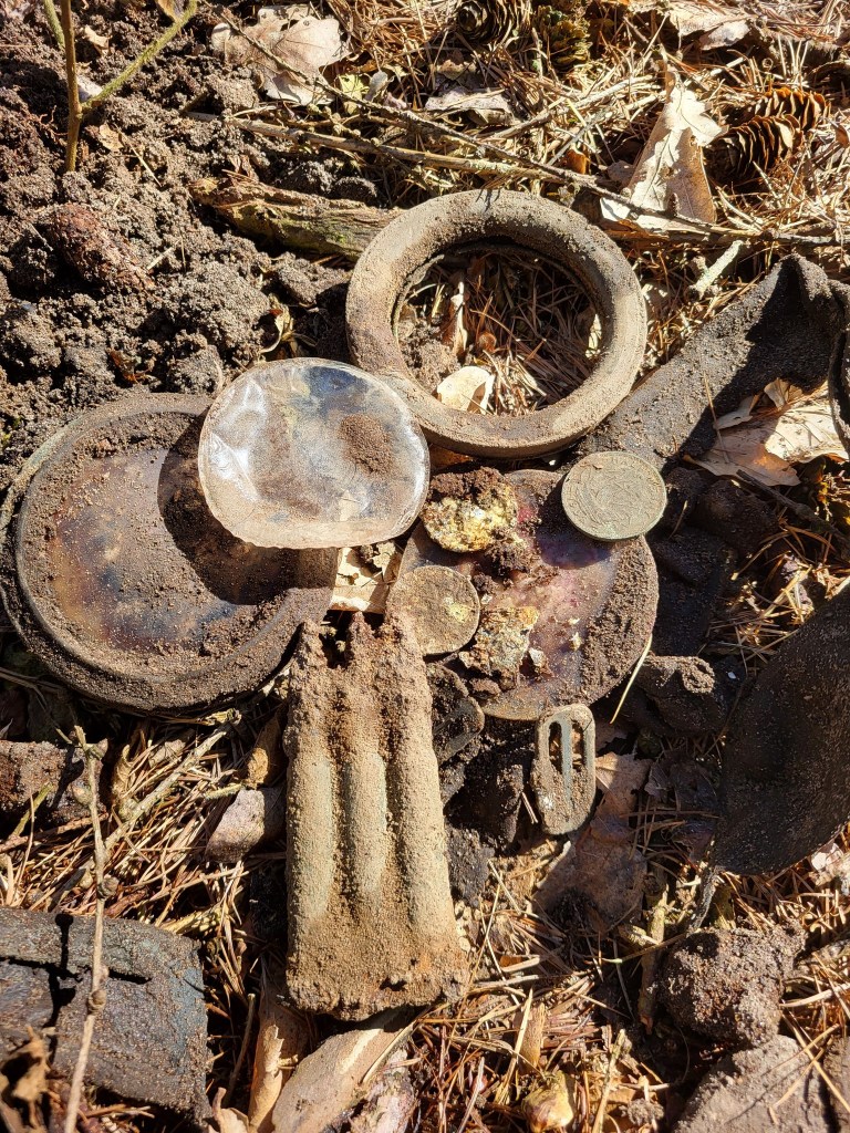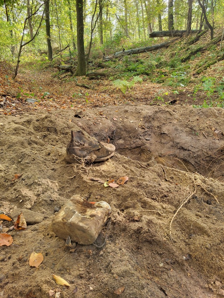 We hadden een kaart gevonden van een verdedigingslinie en toen we daar gingen kijken, tegenwoordig diep in het bos, was er een greppel. We vonden al snel 2 stahlhelmen 3 k98s en een oorlogsfiets. Vervolgens vonden we een schoen van een soldaat. Die hebben we toen aan de kant gezet, dat komen we namelijk wel vaker tegen. Vanwege de altijd aanwezige kans op granaten en ander oorlogstuig graven we enorm voorzichtig en ineens had ik een bovenbeen in mijn hand.
