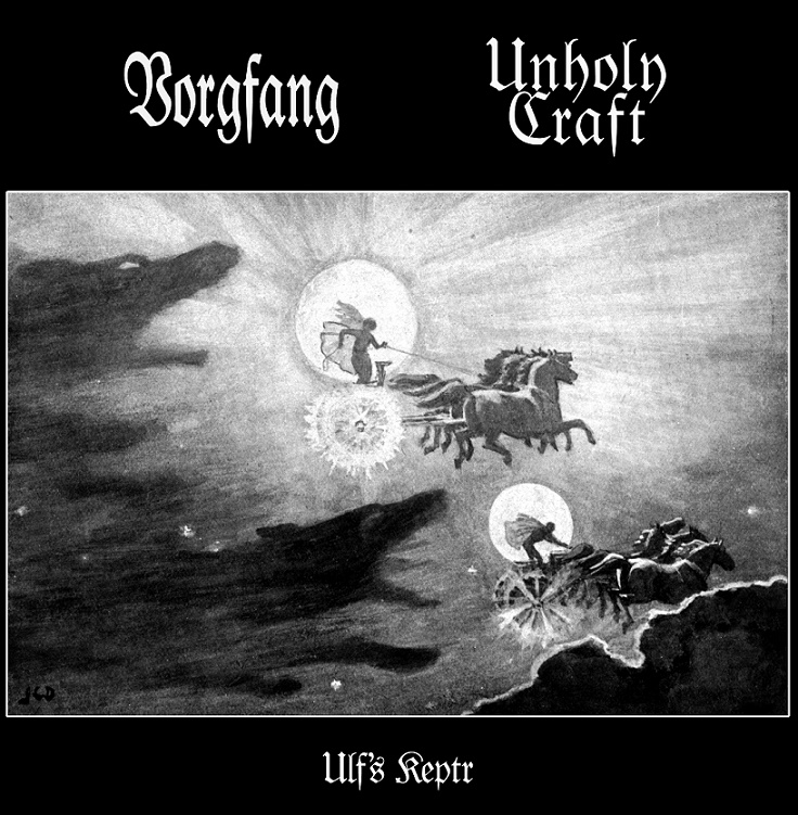 “’t Is niet voor mij, maar voor mijn eenzaamheid”, zei de Man van Melle ooit. Alleen is inderdaad maar alleen, dus besloten de heren Ggatzshriiegk en Peregrinus met hun respectievelijke eenmansprojecten Vorgfang en Unholy Craft de handen in mekaar te slaan voor een heuse split getiteld “Ulf’s keptr“. De titel verwijst in Noorse mythologie naar de “kaak van de wolf” en wordt geassocieerd met de wolf Fenrir en Ragnarök, het einde der tijden. Google deze interessante materie maar even. Nu weten jullie ook meteen welk tafereel er op de albumhoes afgebeeld wordt.