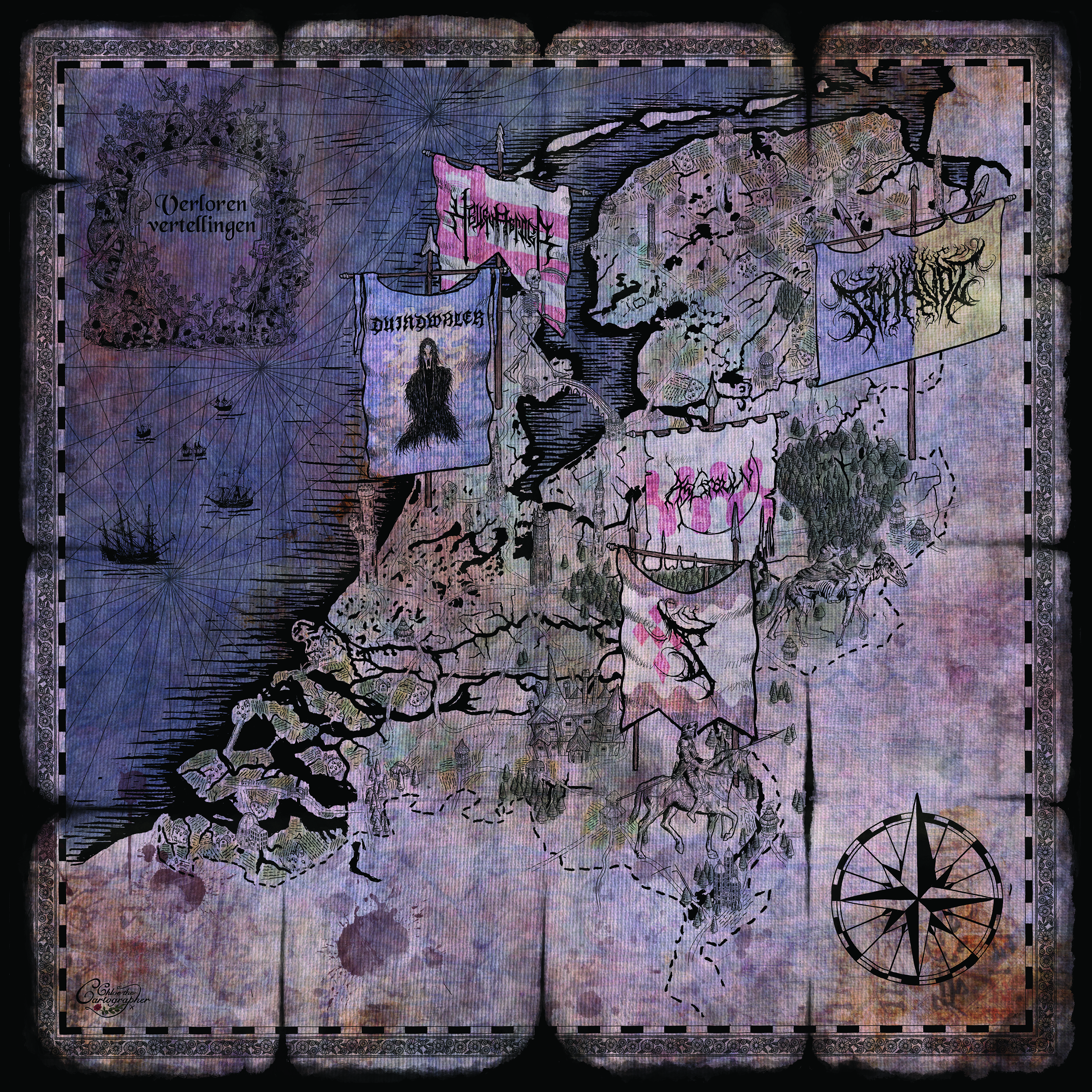 Voor het ontwerp van de hoes van “Verloren vertellingen” klopten jullie niet aan bij een stereotiep metalhoezentekenaar, maar bij een heuse cartografe. Hoe kwamen jullie bij haar terecht?