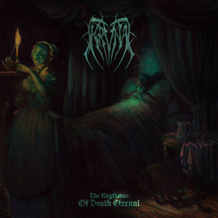 Nu is er “The rhythmus of death eternal“, een EP waarop drie eigen composities prijken die dieper graven in existentialistische thema’s, de dood van God en het bekritiseren van de schepping, aangevuld met twee covers. Het trio gloednieuwe eigen songs verdient best weer het predikaat ‘episch’ want elke track overstijgt de zeven minuten en trekt de polen agressie en grootsheid nóg verder uit mekaar. De songs borrelen over van de majestueusheid, zo pakt de openingsmelodie van “Endless monument” al meteen groots uit, en plaatsen mystiek in een meer helder en scherp licht. Krvna’s black metal klinkt bovendien behoorlijk opzwepend als het gaspedaal ingedrukt wordt, maar de componist gaat evengoed ook meer – zeg maar gerust sensuele – passages die zich laten horen en voelen middels ronduit sublieme gitaarsolo’s en -harmonieën, niet uit de weg. Het hieronder te beluisteren “A God’s work” is wat gematigder qua tempo en komt misschien zelfs nóg overtuigender uit de hoek dan de twee andere songs die heel wat vuriger qua tempo zijn. De sound is wederom krachtig en robuust, best ‘modern’ zonder te plat te klinken.