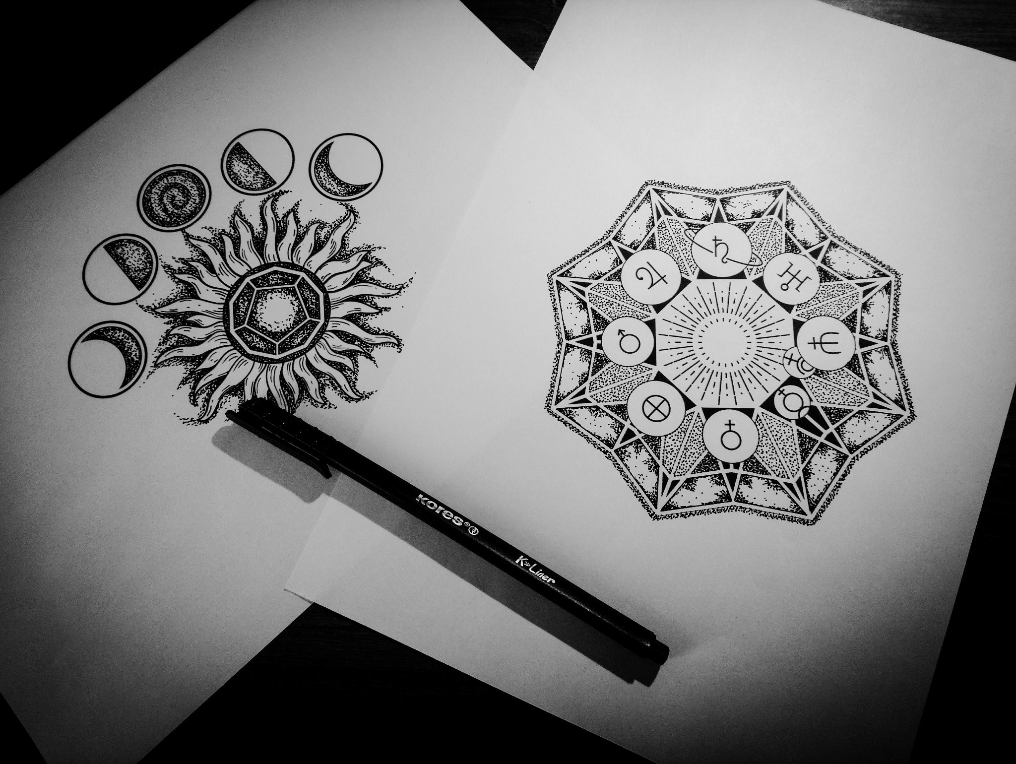 Een tekening toont een zon en de maan in verschillende fasen. Dit vertegenwoordigt de dualiteit in de wereld. In de zon zie je nog een dodecahedron die symbool staat voor het universum. De andere tekening toont een stervormige dodecahedron en de 9 planeten (Pluto heb ik uiteindelijk wel geschrapt), met hun officiële symbolen, draaiend rond de zon. Nadien heb ik nog een levensboom toegevoegd, een slang in de vorm van het oneindigheidsteken en ether kruis op mijn elleboog. De tattoo-artiest heeft het ontwerp wat meer tattoovriendelijk gemaakt. Sommige patronen, die je terugvindt om op te vullen, komen ook terug op de sleeve op mijn been. Het Lhaäd sigil is trouwens een officieel symbool voor de planeet neptunus, maar dan wat aangepast in de stijl van het bandlogo. Deze planeet, vernoemd naar de Romeinse god van de zee, wordt meestal gesymboliseerd door een drietand. Zijn Franse ontdekker Urbain Le Verrier wilde de planeet echter naar zichzelf noemen en daarom werd er destijds in de 19de eeuw een alternatief symbool ontwikkeld met een “L” in. Dit past daarom ook perfect bij Lhaäd. Dit symbool staat ondertussen ook te pronken op mijn linkerpols.