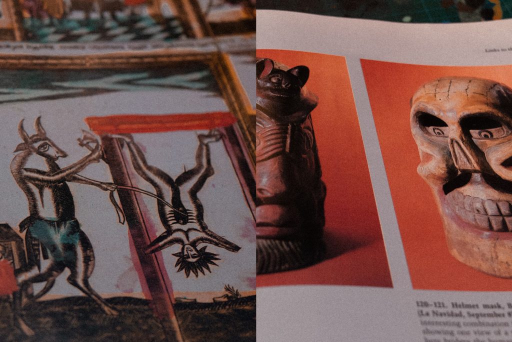 Ik heb veel boekjes waar ik dingen die ik vind in plak. Dat zijn dingen als luciferdoosjes (Indiaas, Russisch, Japans), maar ook etiketten of verpakkingen uit alle delen van de wereld. Die boekjes zitten ook vol met afbeeldingen van kunstwerken die ik boeiend vind, foto’s, stukken tekst, etc. Het zijn arsenalen aan inspiratie. Vaak komt het voor dat ik wandel of onder de douche sta en opeens gevuld wordt met een atmosfeer. Die atmosfeer vertaalt zichzelf al snel in een energie die door mijn lichaam kruipt en visioenen geeft van mogelijke visuele vertaalslagen. Ik maak vaak een krabbeltje of schrijf woorden op die in mijn hoofd opdoemen, maar dan ga ik vaak naar die boekjes om te kijken wat andere mensen al eerder hebben gemaakt en bij die atsmofeer aansluit. Zo laat ik me inspireren in vormentaal, kleur of typografie. Hier maak ik dan een soort cocktail van tot er een beeld ontstaat wat eigen is! Mijn kunst ademt referenties uit het culturele veld, maar ik denk dat dat belangrijk is. Zo min mogelijk muren om jezelf heen bouwen, maar je actief laten inspireren! Op die manier verandert kunst in een estafette waarin iedereen van elkaar leent en doorgeeft. Kunst stroomt en fungeert hierdoor als ader waarin de uitingen rode bloedcellen zijn; een vitale wereld.