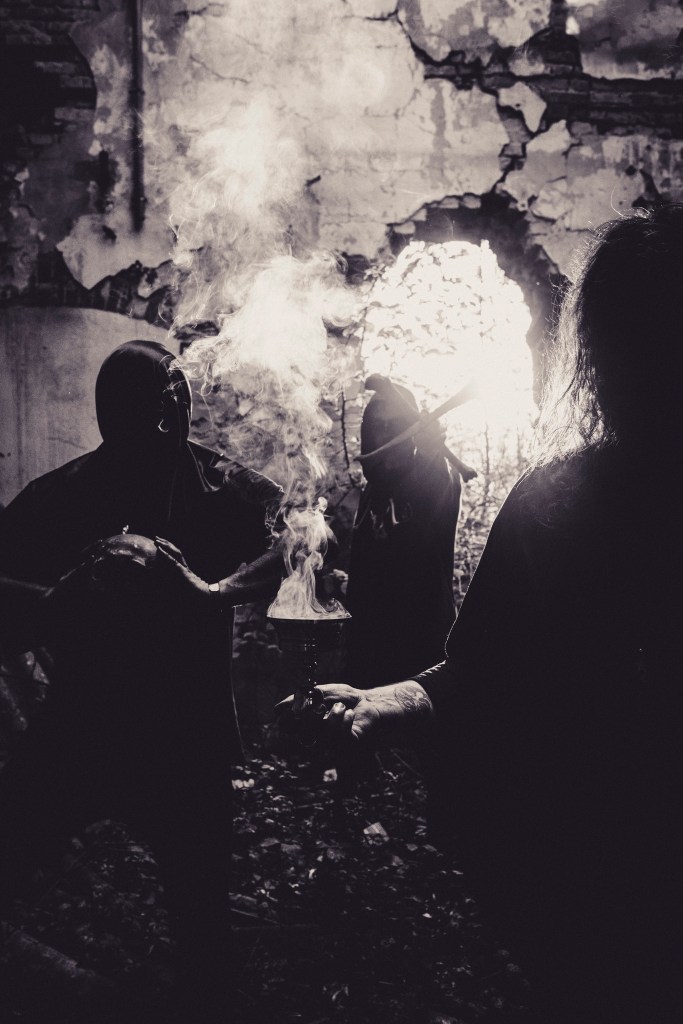 jullie houden jullie teksten geheim, hoewel ik niet zeker weet of er überhaupt zijn. Maar sinds de begindagen vormen spokenwordopnames en samples uit oude horrorfilms, zoals “Cry of the Banshee”, een integraal onderdeel van het geluid van Häxenzijrkell en lijken ze belangrijk om jullie verhalen te vertellen. De gesproken stukken wisselen af tussen mannelijke en vrouwelijke stemmen. Welke factoren bepalen de stem die jullie gebruiken?