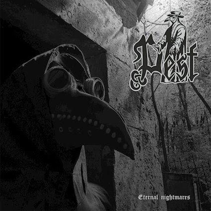 De Metalen Archieven vermelden vijf blackmetalbands die zich Pest noemen, vermoedelijk om al deze redenen. Twee daarvan steken er wat ons betreft echt bovenuit. Allereerst het Zweedse Pest – verplichte kost voor liefhebbers van Katharsis, Bathory en Celtic Frost – dat meerdere sterke albums afleverde, met “Rest in morbid darkness” (2008) als hoogtepunt. Sinds 2013 blijft het daar echter stil. In Duitsland lopen er twee bands met die naam rond. Eén uit Frankenberg, goed voor een demo en één full-length, en de veel interessantere variant uit Hilter am Teutoburger Wald. Daar viel het doek na het onverwachte overlijden van drummer en medeoprichter Mrok in 2011. Postuum verscheen nog “Buried” (2014), waarna het project leek begraven. Toch begon het vuur rond 2021 opnieuw te smeulen. In plaats van een nieuwe drummer te zoeken, besloot oprichter Scum zelf achter de kit te kruipen. Met de komst van gitarist Brandt mondde dat uit in de nagelnieuwe zesde langspeler “Eternal nightmares“.